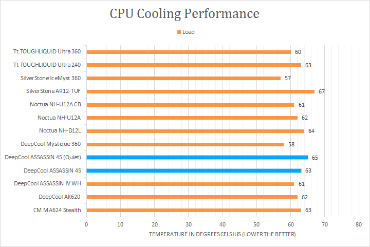 With more than enough time to load the processor, you can see how all the coolers performed with the peak temperatures recorded. From here, the ASSASSIN 4S performed decently well with a maximum CPU temperature of 63c. Compared to the ASSASSIN IV, this cooler was still warmer, but this time by two degrees. However, compared to other coolers, this ASSASSIN 4S was generally competitive, staying close to its competition that employed two fans. In quiet mode, the processor did increase by an extra 2 degrees, but this is as expected. The DeepCool ASSASSIN 4S was more than capable in cooling off the AMD Ryzen 7 3700X, which meant the processor could hit its maximum boost frequencies during the test.