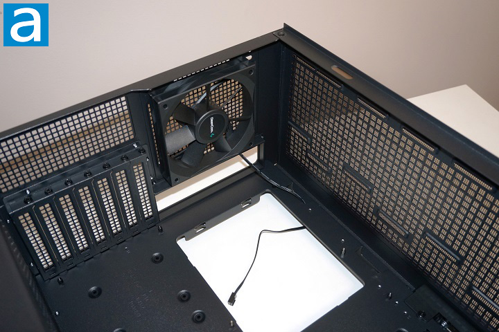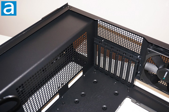 As you can see from the above photo, the top of PSU chamber is basically all mesh for better ventilation. The expansion slot covers of this chassis feature stamped holes for the same purpose, but I would prefer for it to be a solid piece for better dust prevention, since I really doubt it makes a significant difference to just have several small holes here.