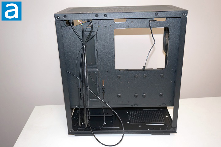 Regarding cable management, between the motherboard tray and the right side panel, the room for cable routing is about 25mm, which is enough to use. Furthermore, the I/O connector cables are pretty much the same as what you would find from any other case. According to the above picture, there is no Velcro strap provided from factory, which means we need to use zip ties for cable management. Even so, there are minimal tie-down points and no cable routing guides, which I think should be added. By the way, there are two long openings with rubber grommets to route cables. There is no need to worry about the safety of the cables or your fingers during installation thanks to these grommets.