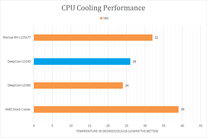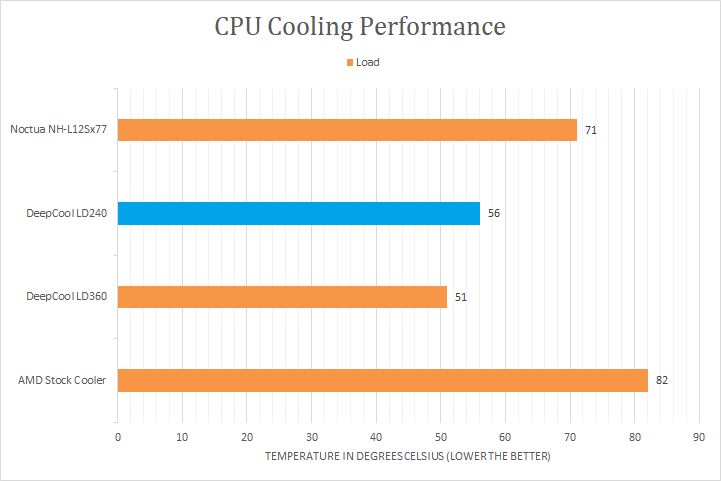 All tests were run on our custom-built computer to best reflect real life performance. The computer remained in the same location in the same room throughout all tests. The room temperature in our testing lab was around 22c. Stock thermal paste respective to all coolers were used to rate its performance. All thermal pastes were given a proper amount of time for them to fully settle. The fans on all heatsinks were connected to the motherboard's CPU 4-pin fan header. The test computer was turned on and left idling for at least one hour for the idling tests. High CPU load results were obtained using the Prime95 in-place large FFTs test with a maximum number of worker threads for the tested CPU for a minimum of 10 minutes or until the temperature was deemed stable. Temperature results were measured with HWiNFO, which reports the CPU's integrated digital thermal sensor for maximum accuracy. HWMONITOR and the screen on the DeepCool LD240 temperature results were also compared. Each temperature result was calculated by taking the maximum value of the cores inside the CPU.