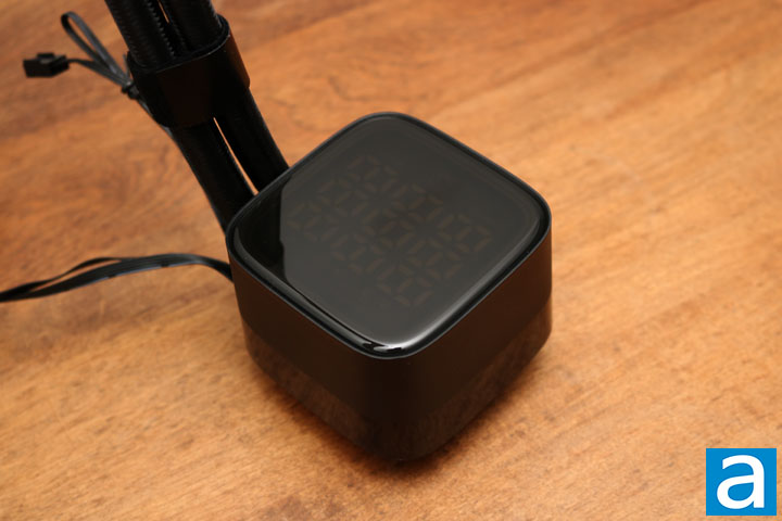 On this side of the tubing, we find the CPU block. It houses the 5th-generation pump and the actual metal plate, which makes contact with the CPU. The measurements for this block are 89mm in length, 78mm in width, and 53mm in height. This is a large CPU block and this is probably due in part to the screen found on the top of it. The screen presents some helpful information on the front, but the added cables and necessary components in the block mean the size is larger. It is a seven-segment digital LED display, so what is presented there should be clean and sharp. The screen, however, only presents preset information, including CPU power consumption, temperature, and load, which cannot be changed. There are also ARGB lighting capabilities on the screen, which can sync with your motherboard and other ARGB lighting components to provide a clean final look.