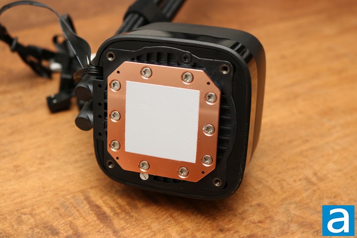 Moving towards the bottom of the CPU block of the DeepCool LD360, we find a copper plate with pre-applied thermal paste. The copper block provides excellent heat conducting qualities. This is valuable to have on the component that makes direct contact with the CPU. Heat transfer should be good due to the copper material and its clean smooth surface. That said, even though to our eyes the surface may look smooth, there are still microscopic imperfections, which reduces thermal conductivity. Thermal paste is included to fill those imperfections and provide cleaner contact between the CPU and the water block. Thermal paste is pre-applied from the factory for the DeepCool LD360, which is nice to a certain extent. It means a novice does not have to worry about applying too much or too little thermal paste. However, the factory often applies too much, meaning extra grease has to be cleaned up after changing the cooler setup. As well, without a tube of thermal paste, you will have to buy new thermal paste for any future changes. It would be nice to have a small tube of thermal paste included. A plastic cover does protect the thermal paste from being smudged during transport.