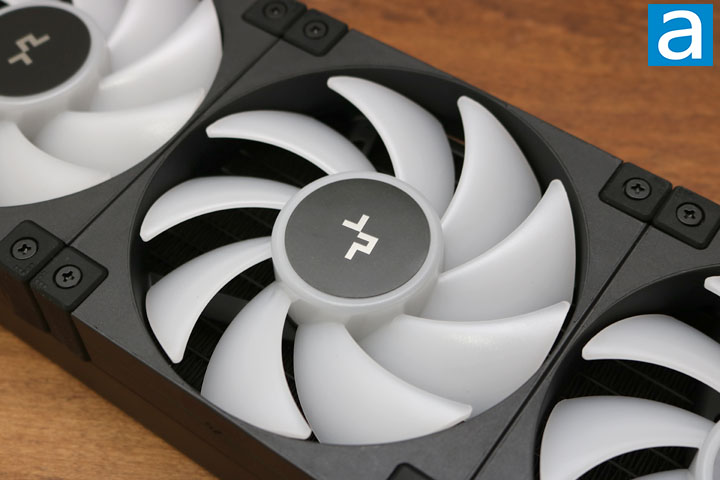 The DeepCool LD360 comes with three FD12 120mm ARGB LED fans rated at 12V, 0.22A, and draws 2.64W. The white fan blades provide the main point of contrast with the rest of the build. The different color helps the LEDs to be seen more clearly. These fans have a hydro bearing, which is intended for smooth and quiet operation. We will investigate the actual noise output on the next page. The fan speed is rated to range from 600RPM to 2400RPM, generating up to 72.04 CFM of airflow. The fan air pressure is 3.48mmAq, while the rated noise output is 38.71dB(A). The fans connect to the motherboard via a 4-pin connector, meaning they are PWM.