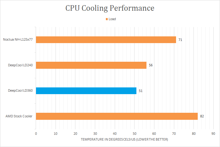 All tests were run on our custom-built computer to best reflect real life performance. The computer remained in the same location in the same room throughout all tests. The room temperature in our testing lab was around 22c. Stock thermal paste respective to all coolers were used to rate its performance. All thermal pastes were given a proper amount of time for them to fully settle. The fans on all heatsinks were connected to the motherboard's CPU 4-pin fan header. The test computer was turned on and left idling for at least one hour for the idling tests. High CPU load results were obtained using the Prime95 in-place large FFTs test with a maximum number of worker threads for the tested CPU for a minimum of 10 minutes or until the temperature was deemed stable. Temperature results were measured with HWiNFO, which reports the CPU's integrated digital thermal sensor for maximum accuracy. HWMONITOR and the screen on the DeepCool LD360 temperature results were also compared. Each temperature result was calculated by taking the maximum value of the cores inside the CPU.
