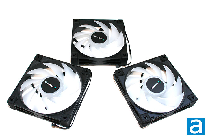 The radiator fans used for the DeepCool LS720 are ARGB LED fans that have unique headers. The headers plug into the side of the fans, which is meant to allow for daisy chaining to keep the build clean. While I respect this effort, I do wish DeepCool had found a way to use 4-pin PWM and 3-pin ARGB headers for the daisy chain configuration, just like with the ARCTIC Freezer II 280 A-RGB. As it stands, these fans can really only be used as radiator fans for this specific cooler. Moving on, these fans use hydraulic bearings. The blades are angled at approximately 47 degrees from the center impeller. The fan blades themselves also have a frosted look. These fans run at a maximum speed of 2200 RPM ± 10%, which produces a static air pressure of 3.27 mmH2O, 85.5 CFM airflow, and maximum noise output of 32.9dBA. These are strong numbers for these cooling fans that give me high hopes for the performance.