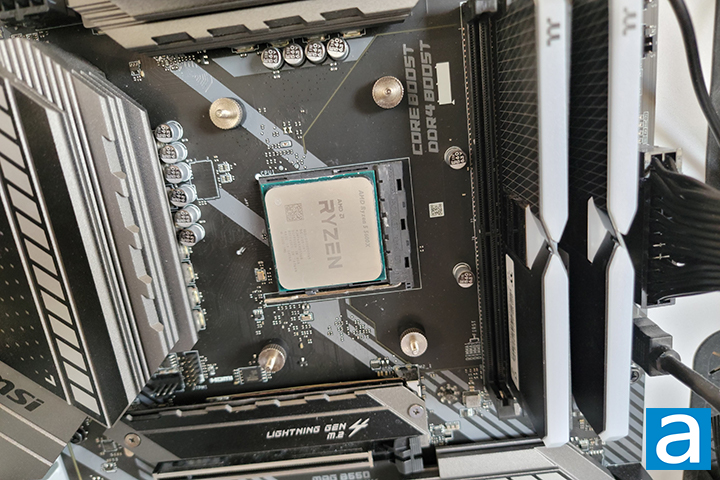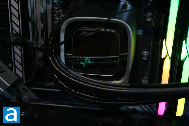 Placing the water block over the top of the processor was as simple as the rest of the installation. As mentioned earlier, thermal paste is already pre-applied on the contact base, so you do not have to worry about applying it yourself. With that said, I would have liked it better if DeepCool had provided their own thermal paste for you to apply. You, of course, must also install the mounting brackets on the water block first, which is different between Intel and AMD processors. Keep in mind for 12th generation Intel CPUs, the tubes should be at the 6 o'clock position, facing south, on the water block for maximum performance according to DeepCool's internal testing. We did not do this here, since the LS720 was installed on an AMD CPU.