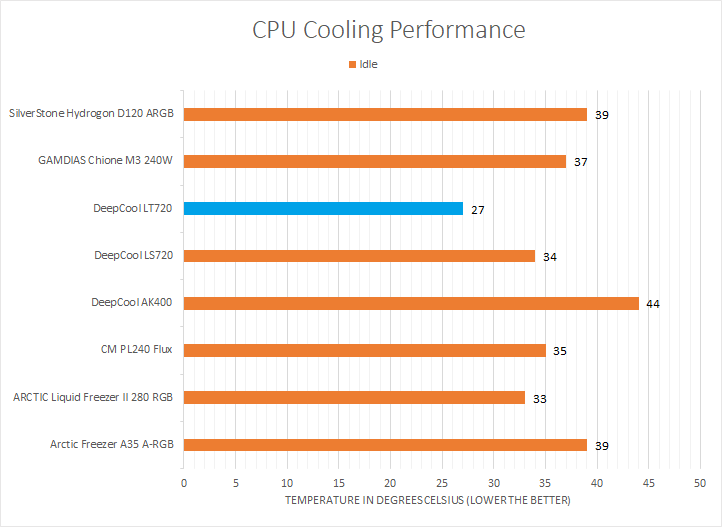 For the first test, I let my computer sit idle for a while. After about an hour, I shook my mouse to wake my computer up. We can see the DeepCool LT720 sat at around 27 degrees Celsius. This outdid all the other liquid coolers by a considerable margin. It goes without saying but the LT720 also outdid all air coolers by a fair bit. This difference in idle thermals is likely due to the tubes being placed in the 6 o'clock position in this case, which could be related to the water block's skived microchannels. The LS720, despite having the same pump, could not be installed in this manner on AMD CPUs, as discussed on the previous page. While this is a great start, idle tests do not give a full representation of the cooling capabilities, thus leading us into our load tests.