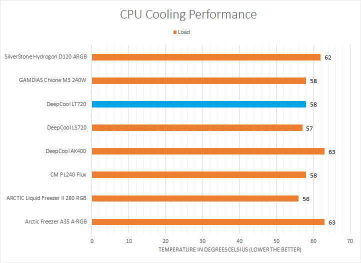 Starting Prime95 and giving the processor ample time to load all the cores and threads, we can see how the cooler performs when the processor is under heavy stress. The DeepCool LT720 performed just as well here, peaking at 58 degrees Celsius. This tied with most of the GAMDIAS CHIONE M3-240W and the Cooler Master MasterLiquid PL240 Flux, while falling behind the ARCTIC Liquid Freezer II 280 A-RGB and DeepCool's own LS720. This also surpassed all compared air coolers, although this is not a surprise. It should be noted at this point all liquid coolers in these tests performed very similarly in the stress tests with the largest difference being only 2 degrees. We observed the boost frequency throughout the test, which was 3.7 GHz across all cores. The DeepCool LT720 performed excellently in our tests.