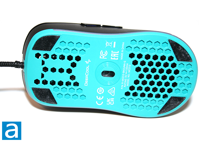 At first glance, the DeepCool MC310 looks like your average lightweight mouse with a honeycomb shell for weight savings. There is no branding present on the top exterior shell. Despite DeepCool claiming the grip type of this mouse is for right-handed users, the MC310 has a symmetrical shape suitable for left-handed users too. Both sides of the mouse have smooth grips, and it is easy to hold. I like the way its matte black finish looks. The honeycomb shell is made out of smooth plastic, and thanks to the strong matte black plastic finish, fingerprints do not show easily. Greasy hands will still leave a mark though, so just be sure to wash your hands whenever you finish eating. Speaking of food, it is wise to be careful when eating around this device as crumbs can easily fall through the holes.