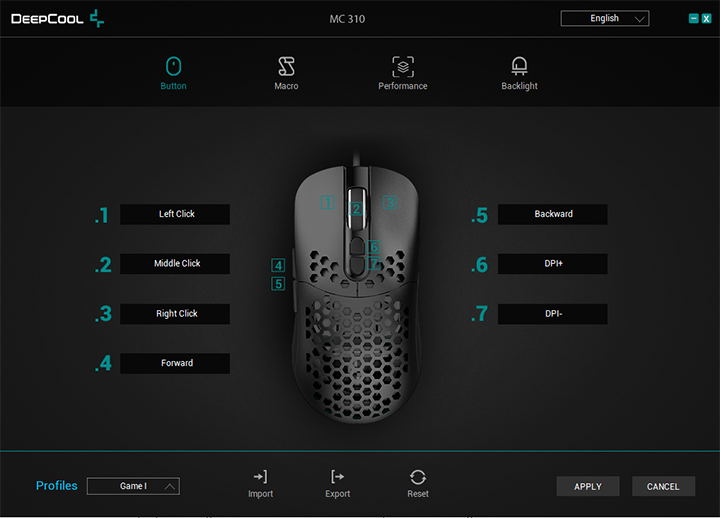 Finally, the backlight tab is for changing the RGB LED lighting effects on the mouse. As mentioned earlier, there are a total of twelve lighting options. Each one has its own pattern adjustments, such as clockwise or anti-clockwise or selecting a specific light shift speed. On top of all that, there are four available profiles for users to save their different settings to. The profiles are labeled as "Game 1", "Game 2", "Game 3", and "Office". You will need to map a profile cycle function to one of the buttons if you wish to have access to all four without having to use the MC310 software. The profiles only save the button mappings, which is reasonable for a budget mouse. It should also be noted that users can import and export settings along with resetting to the default settings.