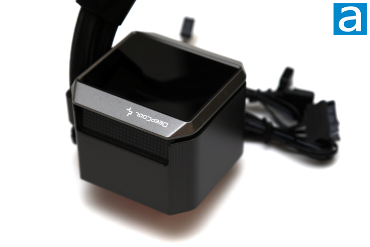 On the other end of the tubing, we have the water block and pump combination of the DeepCool Mystique 360. This cooler has the company's 5th-generation pump. It measures 93mm in length, 77mm in width, and 66mm in height, making it larger than other water blocks. This increased size is primarily due to the inclusion of a screen on top, which measures 2.83" across. Notably, it also surpasses the size of screens found in competing products, such as the Thermaltake TOUGHLIQUID Ultra 360. Moreover, its rectangular shape means the screen does not cut off the corners like a circular one would. The screen has a resolution of 480x640 pixels, resulting in a pixel density of just over 282 PPI. This is higher than a 24" 4K monitor, which is 184 PPI. Down the sides of the CPU block, we have some ARGB LED lighting and a slight indented area with a grid pattern to show off DeepCool's square arrays.