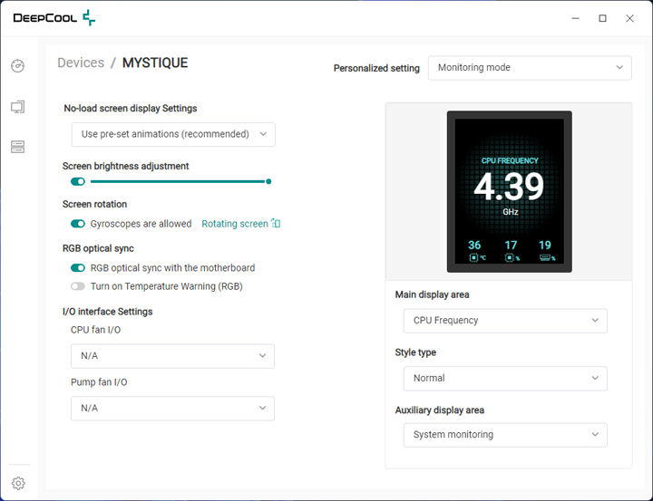 When you get to the Devices tab, you will find the options for the Mystique 360. From this screenshot, there are settings on the left for the screen, including setting brightness, the aforementioned gyroscope, lighting synchronization, and other settings. On the right side, you can change the "Personalized setting", which lets you choose between monitoring, media, and recording modes. Monitoring mode shows standard processor and memory statistics, as we stated previously. In media mode, you can upload images or animated GIFs to the block to display moving images. This includes changing the lighting to synchronize with the displayed media, which adds to the overall aesthetic. Finally, in recording mode, the screen shows graphs of the CPU frequency and temperatures for up to the past seven minutes. Overall, the DeepCool utility is pretty easy to use and works as you might expect. I did not notice any instabilities or problems during my testing.