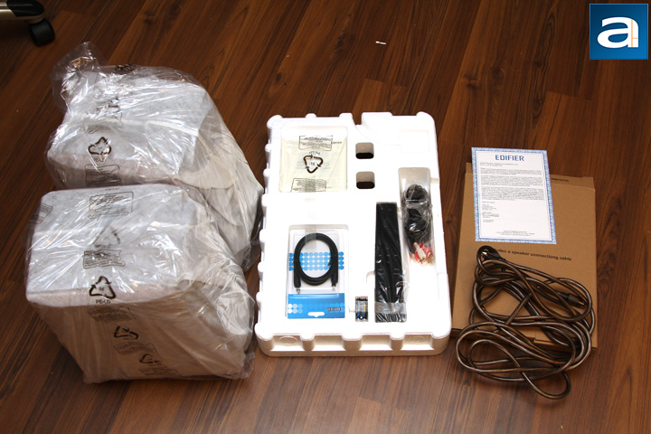 Upon opening the box, you will be greeted by a Styrofoam tray containing all the accessories in its partitions. The Styrofoam tray doubles as a bracket that holds the speakers in place underneath it; where each speaker is neatly wrapped in several layers of foam and plastic to ensure everything arrives to you in pristine condition. A separate slim box labeled "Includes a speaker connectoing cable" -- note the spelling error -- includes a cable that connects the left speaker to the right speaker.
