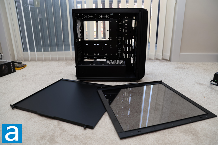 To open the Endorfy Arx 700 ARGB, you can loosen the two thumbscrews at the back and slide off the sides. Both sides have clips on the front, so they do not easily fall off unless you intentionally move it off. The tempered glass panel holds to the rest of the case with a metal frame inside. There is a strip of foam padding on the top and bottom edges to reduce any hard surfaces contacting each other. The pane of glass is tinted, so that only illuminated items will really shine through while obscuring cables and other darker components. The metal frame also creates a handling area where users can hold the side without leaving their fingerprints on the inside. The solid metal panel on the right side slides off with ease, but does not have any other defining features.