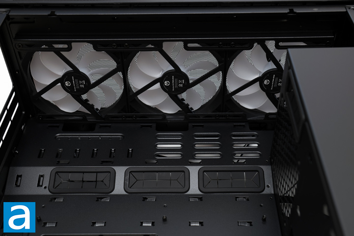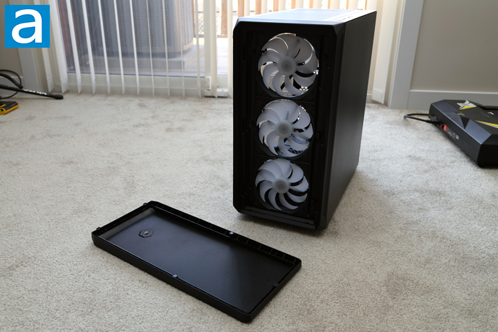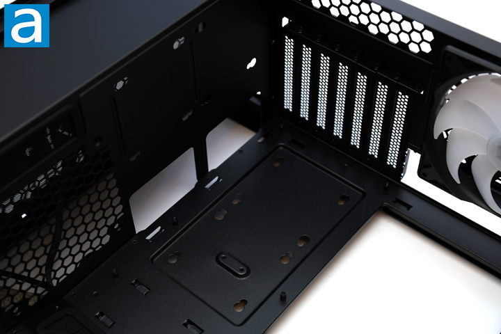 Down to the bottom, we can see the expansion slot covers. There is a total of seven slots, which is typical for a mid-tower case. Vertical mounting of your graphics card is not supported in the Arx 700 ARGB. At the bottom, you can see the cover between the power supply and the rest of the chassis. There are ventilation holes on the shroud with mounting points for an additional 120mm fan. There are more routing holes on the shroud with some near the back for the I/O headers. The back holes do not have rubber grommets. There are mounting locations to install two 2.5" drives on this power supply cover.