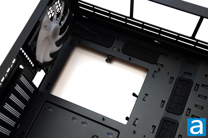 On the inside of the Endorfy Arx 700 ARGB, we first have the cutout behind the motherboard. This is useful for installing third-party coolers, as you can change the mounting mechanism while keeping the motherboard in place. The opening is rounded over to prevent your fingers or cables from getting cut on the edges. There are two openings above the motherboard, and each are hidden with rubber grommets. There are no additional holes for behind-the-motherboard headers, so you should be aware if you have a motherboard with this feature. At the top, you can see the rails for mounting cooling options. There is quite a bit of space here to install radiators or fans, with room for two 140mm fans, three 120mm fans, or a radiator up to 360mm in size. The back also has another Stratus 140 PWM ARGB fan. It is already connected to the included fan and lighting controller at the back.