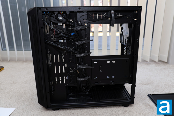 At the front, we have three aforementioned Endorfy fans, with all of them properly wired to the back controllers. At the front, you can see the angled holes for cables. Again, these have rubber grommets which make cabling neater and easier to manage. Finally, you can catch a glimpse of the grommet-covered hole at the front of the shroud to connect and power your graphics card.