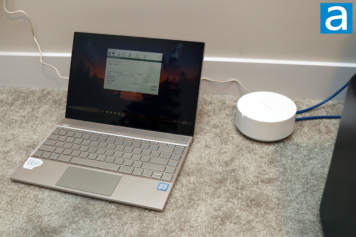 For the tests, the EnGenius ESR580 wireless router was placed on the main floor of my house. My media PC with a Gigabyte UD Pro 256GB SSD was connected to the router via a CAT5e cable on a Gigabit Ethernet connection. On the client side, a 2018 13" HP Envy 13 with an Intel Wi-Fi 6 AX200 network adapter card installed running Totusoft's LAN Speed Test application was used to transfer 500MB test files to evaluate real-world throughput. In our results, "upload" is defined as data transfer from the client to the server via the wireless router; conversely, "download" is defined as data transfer from the server to the client via the wireless router.