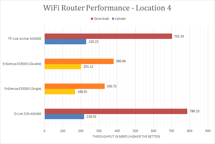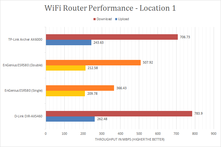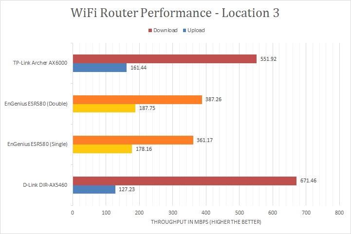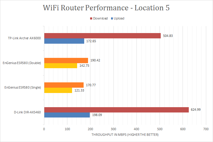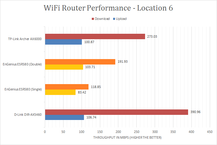 Overall, the EnGenius ESR580 performed about as expected for a Wi-Fi 5 or 802.11ac device. Its peak download numbers of 366.43Mbps and 507.92Mbps on one and two mesh routers, respectively, was good. Unfortunately, at further distances and more obstacles, the Wi-Fi 6 routers were clearly dominant, even though those routers were contained in a single unit. It is clear that having the second node did provide a bit more speed as we saw raw number increases, albeit some less than others, at almost every location for both upload and download. Another bright spot is the upload speeds stayed above 100Mbps with two nodes attached, while download speeds were also above 150Mbps. As such, it is possible the backhaul between the secondary and primary mesh nodes was a limiting factor, which is why we do not necessarily see double the performance with a second unit added. Adding more nodes may increase the signal strength and range, but unfortunately, we will see diminishing returns in terms of speed performance. Obviously, this will also depend on the size of your house and how you set up your routers.