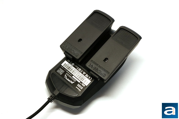 From the bottom, you can see the swappable sensor, which I think is one of the coolest features of this mouse. Considering the manufacturer's page has a gun in the background when they advertise this feature, it has to be cool. It definitely is nice to be able to switch out which sensor one wants to use. EpicGear also made it quite easy to switch between the two. First, you have to remove the grey outer shell, then the sensor slides out easily. The two different options are the 3360 optical sensor and the 9800 laser sensor, which gives you up to either 12000 or 8200 DPI, respectively. I am fairly sure no one uses 12000 DPI for gaming, but it sure is nice to have the flexibility. Otherwise, the bottom features three Teflon feet for easy gliding. There is one large one at the top and two smaller ones on either side of the sensor cartridge. Lastly, the sticker on the bottom carries some identification information, such as a barcode.