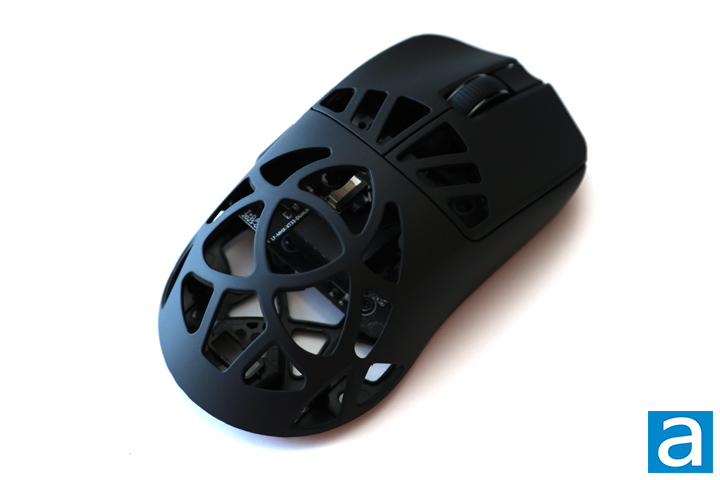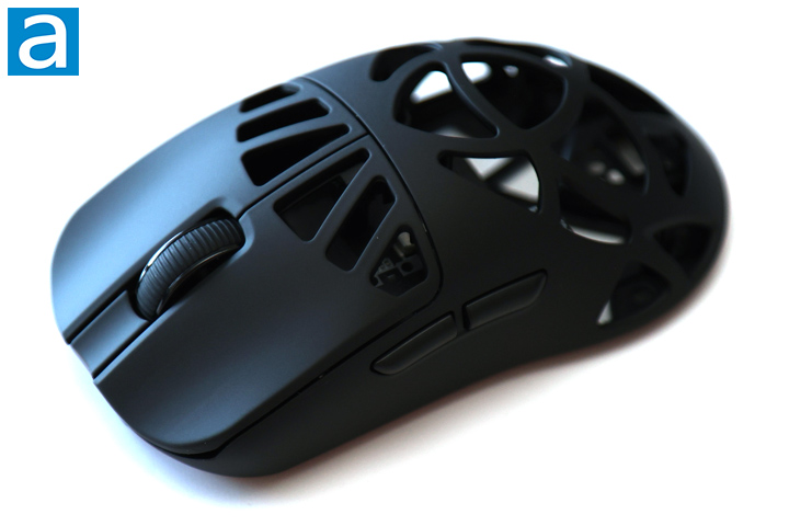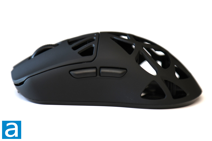We have seen many light mice previously, and the Epomaker Carbon X looks like the early examples of ultralight mice. This includes the holes all over the shell. These holes are found on the whole body and on the mouse buttons. This exposes the internal components of the Carbon X, but also shows how minimal they have made the shell. On the other hand, unlike ultralight mice like Cooler Master MM711, the Carbon X has much larger holes. Due to these large holes, I would tell you to avoid eating or drinking near your mouse, as the Carbon X is not protected from any elements. These holes are also found on the bottom of the mouse, as you will see shortly, which means dust can accumulate in these areas after some time. The holes are likely to grab most of your attention, as the rest of the Carbon X is clean in look. The black shell is finished with a matte surface and slightly grippy surface. It resists showing handling marks, although overtly greasy fingers will leave their mark on the Carbon X.