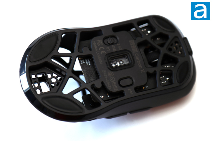 The rest of the buttons on the Epomaker Carbon X can be found at the bottom of the mouse along with the optical sensor. There are four primary areas of PTFE feet to keep the mouse gliding on any surface. An additional Teflon ring around the sensor can be seen to prevent this area from catching onto your surface. The sensor in question is the PixArt PAW3950, a high-end sensor for wireless mice. The recently reviewed Turtle Beach Burst II Pro uses a sensor that is based on this one too. This offers a sensitivity range of 50 to 30000DPI in 50DPI increments. The sensor promises 750 inches per second tracking and acceleration of up to 50G. 1000Hz polling rate is standard, but you can increase this to 2000, 4000, and 8000Hz, or decrease it down to 500, 250, or 125Hz. Over Bluetooth, this polling rate is limited to 125Hz. Otherwise, there is no sensor or lens rattle with the Carbon X.