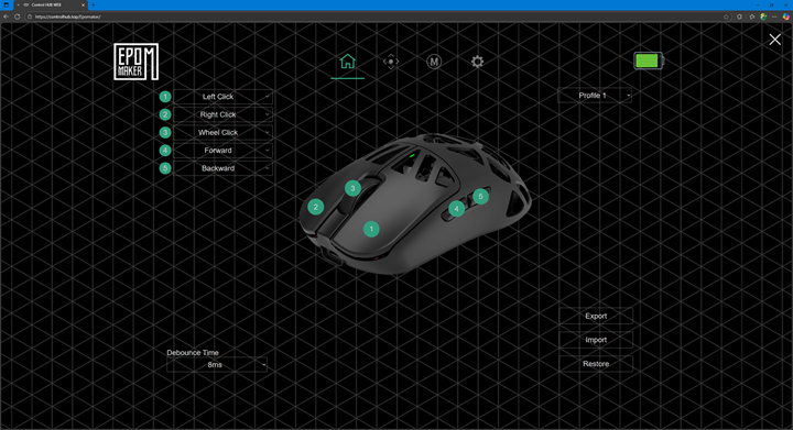 As we have seen from most Epomaker products, the Carbon X can be configured with a webpage utility, which is called Control HUB WEB. You should make sure you are using a Chromium based browser, such as Google Chrome or Microsoft Edge, as I could not get the mouse recognized in Mozilla Firefox. All the different menus are selected with the top four icons. The first page is meant to configure the inputs of the Carbon X, which includes all the top buttons but not the one underneath. This lets you save the settings to one of four different profiles, although there is no default button to cycle through profiles. You can also configure the debounce time, export or import profiles, or reset the Carbon X to its default settings.