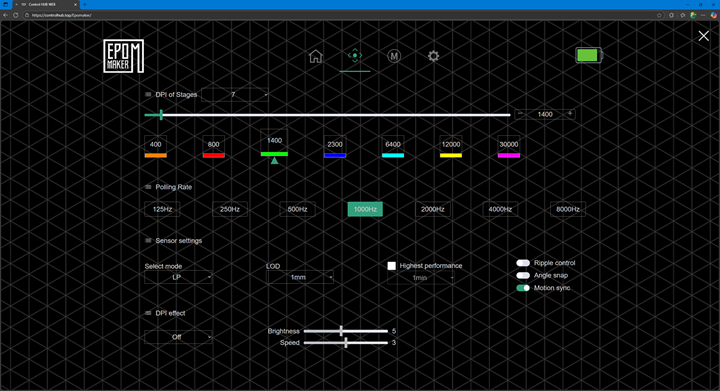 On the second menu, all the different operation settings are available here, including the different DPI sensitivities and steps. By default, there are seven enabled, but this can be reduced. You can also change the polling rate, lift off distance, ripple control for correcting jitter, angle snapping, and motion sync for smoothing correction. There are a few other settings such as mode selection and a checkbox for highest performance, although it is not clear what these do. Finally, you can change the lighting to show the DPI effect if you desire.