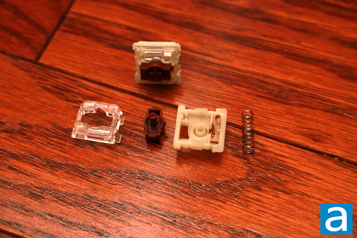 As usual, the key switch has a few different components to it. There are the two pieces of outer housing, which you can see above. The main stem can be pressed down to actuate a key. Inside the switch is a two-stage spring measuring 13.5mm in length. The stem of the switches is POM with a polycarbonate top housing and a Nylon PA66 bottom housing. The switches are lubricated from the factory. Overall, the different internal components of the Carbon60 are well-made.