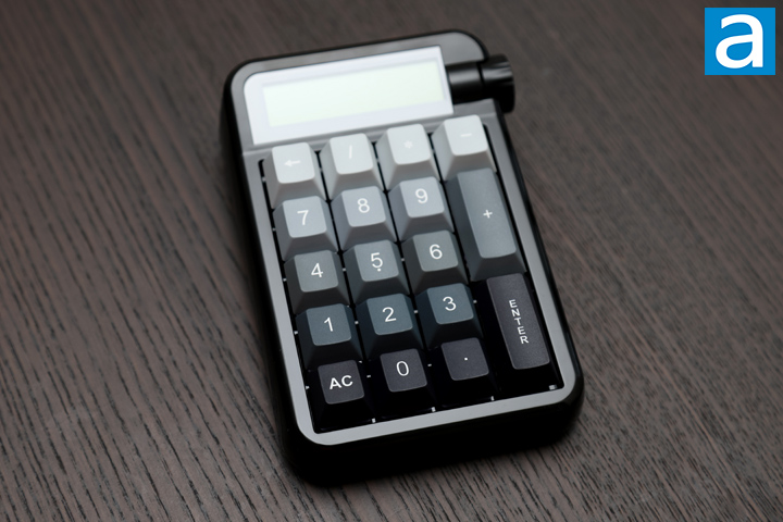 The layout of the Epomaker Cypher 21 is standard-looking for a number pad, but there are a few differences from what you might expect from the right section of a full-sized keyboard. For example, the top row does not have a Number Lock, but instead, there is a backspace key. The bottom zero, which normally would occupy the space of two keys, is split into two keys, with the zero in the middle and an "AC" button beside it. These two buttons are necessary, because the Cypher 21 can function as a basic calculator if you desire. This is why there is a screen on top of the keys as well.