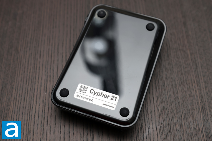 The underside of the Epomaker Cypher 21 has four rubber feet in the corners of the device. This ensures the number pad does not slide around. Furthermore, you can see the glossy black finish, especially with how reflective it is. On the lower half, we have a single label that has the Epomaker logo, product name, some regulatory certifications, and a note to say it is made in China. Otherwise, one thing that I could not find is a screw hole, even after peeling away the label and the rubber feet. The Cypher 21 is put together with internal plastic clips, so I could not disassemble the product without breaking something.