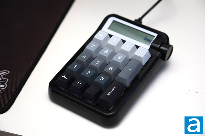 The Epomaker Cypher 21 might just be a number pad, but Epomaker has done a few things to make it stand out. For one, the black exterior we have today looks really clean with its glossy piano black finish. This does mean it will attract fingerprints, but at least it looks nice to start with. There are thick edges around the keypad area, while a large screen stretches across the top. A plastic knob is on the right side of the number pad in the same black finish. Overall, the design of the Cypher 21 is a bit retro-like, especially with the large bezels, LCD display at the top, and the gradient gray keycaps. If you do not like this black and gray appearance, the Cypher 21 also comes in a pink version.