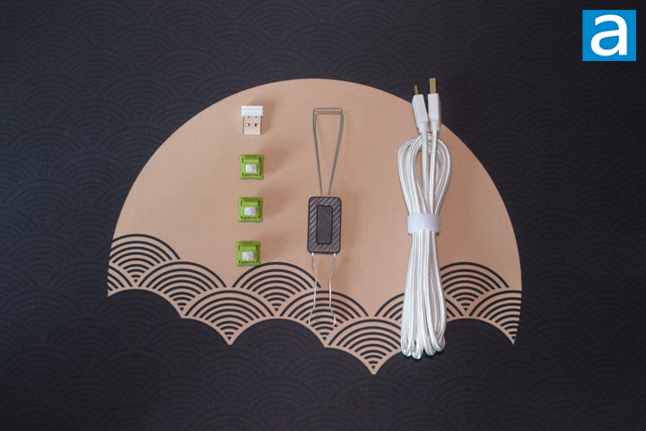 In the box, you will find the keyboard wrapped in a plastic cover. Separately, we have a couple of accessories such as the manual, a white braided USB Type-A to USB Type-C cable, keycap puller, 2.4GHz wireless USB dongle under the right flip-out feet, and three replacement key switches. Otherwise, everything is packaged well inside to keep everything safe during transit.