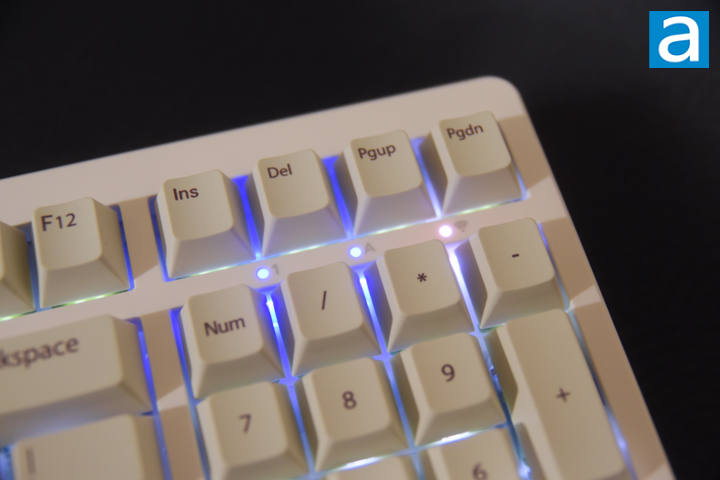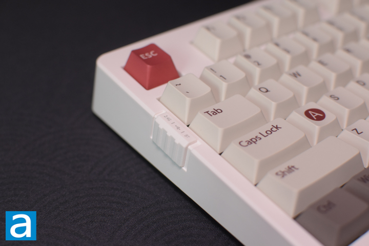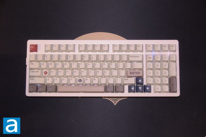The keycaps are Cherry-profile, my personal go-to, with dye-sublimation legends and constructed of polybutylene terephthalate, or PBT, plastic, which offers good wear resistance. Using dye-sublimation, the ink in the key legends is baked in and cannot be scratched off without removing the plastic, while PBT plastic resists becoming shiny and smudging longer than ABS plastic. The dye-sub process is cheaper than double-shot or triple-shot injection molding, but in this case, it allows for greater creative freedom in designing the keycaps at a lower expense. The PBT plastic is good to see, as they are quite durable and usually deeper in sound. Most of the keys are a light green, off-white color with brown font. The bottom row is gray, and the Enter and space bar are tan. The legends are crisp and sharp. Other special accented keys include the red Escape key and the navy-blue arrow keys. The “A” and “B” keys are in red and blue circle legends that are reminiscent of game controller buttons. The overall aesthetic is definitely going for a retro vibe. For replacing keycaps, most universal sets should fit. There are some keys that are spaced differently, including the right Shift being 1.75U and the number pad "0" being 1U. Otherwise, the bottom row modifiers are all 1.25U, while the space bar is 6.25U.
