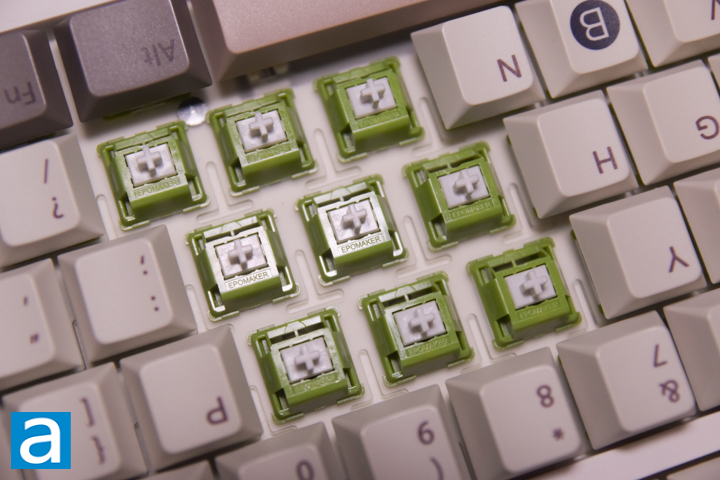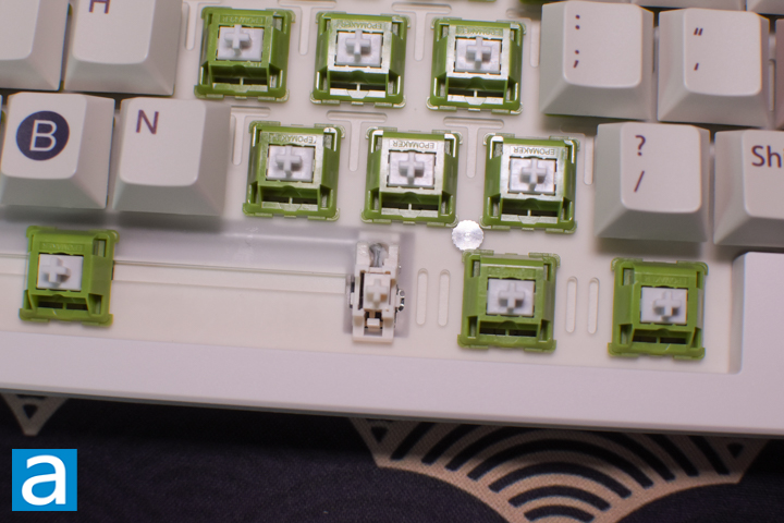 Underneath the keycaps, we find the Epomaker Peace Lily switches. They are oriented in a south-facing manner on this board, meaning the RGB LED light is towards the bottom. This is welcomed by keyboard enthusiasts, as it will allow the switches to operate without inference when used with Cherry-profile keycaps. The key switches themselves are green and white in color. They are linear switches, which have a smooth travel from beginning to end. To liken them to Cherry MX switches, they are a lighter version of Cherry MX Red. The Peace Lily switches have a 30g initial force to get it moving, an actuation force of 42g, and a bottom out force of 47g. The pre-travel for the switch is 2mm, which is fairly standard for mechanical keyboard switches, and a total travel distance of 3.6mm, which is a little shorter. The expected lifespan is 50 million cycles.