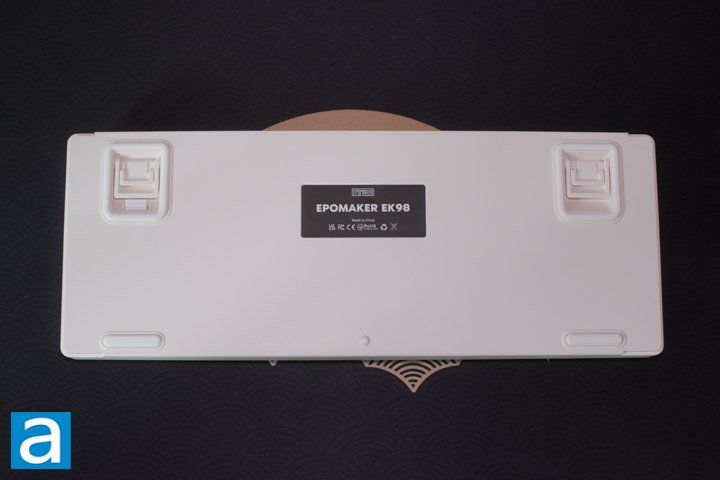 The bottom of the case has a few interesting elements. There is a label with the name of the keyboard and being made in China. There are a few certification symbols as well. The back side features flip-out feet on the left and right with two stages to further angle up the keyboard. When viewing it from the back, under the left foot, you can find the 2.4GHz USB dongle neatly slotted inside. There are four total white rubber feet, and provide pretty good grip on whatever surface you choose to put it on. The two in the back encircle the flip-out feet, while the two in the front are elongated pill-shaped.