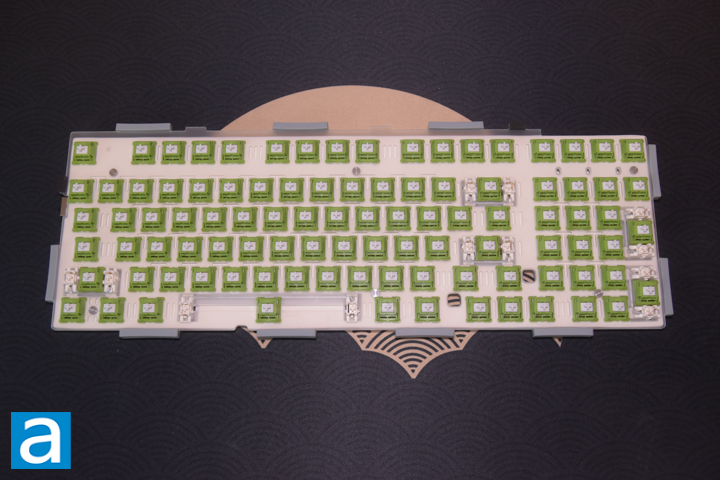 Once the top housing is separated, we can see the internals of the keyboard. The polycarbonate plate is mounted on ten silicone gaskets that rest in between the top and bottom housing. This helps in dampening vibrations when typing.