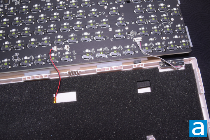 When lifting the assembly with the PCB and plate assembly, there are two separate wires to be aware of. One set of wires near the middle connect the battery, while the other set connects to the USB daughterboard. The bottom housing is where the battery and daughterboard are mounted, with a 4mm piece of black foam present to dampen internal noise. There are two posts in the middle of the back housing to align the upper plate components.