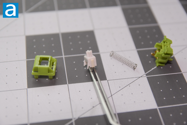 The Peace Lily switches are based on the original Cherry MX design, as the patents expired some time back in 2014. The jade green colored housing is made of polyoxymethylene plastic, also known as POM. The benefit of POM is that it has high abrasion resistance and strength, giving it very good sliding properties. It usually gives the switch a more “thocky” or lower resonance sound. The white stem is made of polycarbonate. This helps the stem to be tough, and is hard enough that changing keycaps should not cause the stem to deform. The spring is 20mm long, which is on the longer side. This should help with stability and linearity of the switch. There is a little bit of stem wobble from side-to-side and even more forward-to-back movement. This movement can make the keys feel more economical and less comfortable when typing due to the extra movement. Fortunately, the stem wobble did not affect the typing experience too much. Considering the switches retail for around $0.25 each, they perform well with a nice and pronounced bottom-out pop.