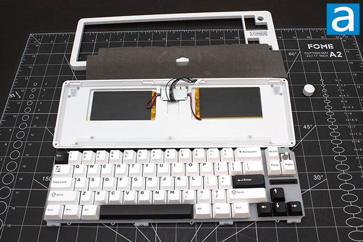 The disassembly process of the Epomaker Galaxy68 is quite simple. I started by unscrewing the bottom case. Note you will need your own screw heads as no tool is provided to open up the case. There are four easily accessible points on the corners of the case. While I could start by removing all the keycaps, I typically have a preference to remove keycaps and switches after disassembly if necessary. It is important to note that you will have to remove the knob to remove the internals from the top frame. Upon removing the screws, I pulled apart the outer case. This disassembly process was quite familiar with many of the more premium cases I have worked with. It was a good experience to take apart. Upon exposing the interior design, I was quite pleased with the design. As this is a wireless keyboard, there is a nice cutout for the two 3000mAh batteries and the daughterboard in the bottom case.