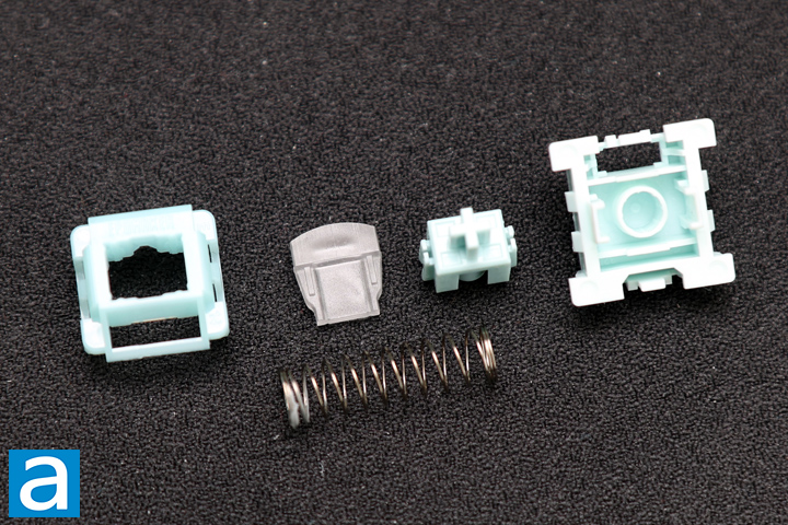 Taking a closer look at the Epomaker Creamy Jade HE switch, it has a blue top and light teal bottom. A stem is in the middle with a 20mm spring that keeps the switch elevated. The switch stem has minimal lateral movement inside the housing, which ensures actuation is stable and the keys do not wobble about. The switches are factory lubricated for a smoother typing feel and sound, and you can see some excess lubricant on the spring. The stem is made of POM plastic. The upper case is polycarbonate, while the bottom one is PA66, which refers to polyamide or nylon 66. A thin translucent acrylic light diffuser is located on the south side of the switch.
