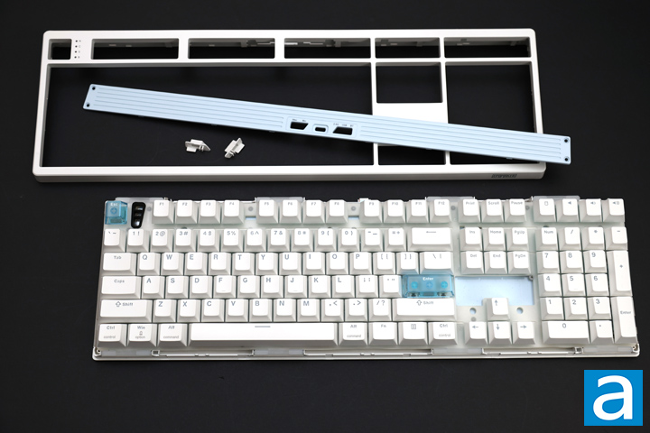 Taking apart the Epomaker HE108 is a bit more involved due to the use of plastic clips holding everything together. With some pry tools, I was able to expand a small gap at the back corner of the keyboard and work my way around. You will also need a small hex key or screwdriver to take the back blue plate off before you can detach everything. This plate holds the back two toggle switches in place. Once the clips are released, the top and bottom separate from each other. The keyboard portion is held to the bottom daughterboard with a ribbon cable.