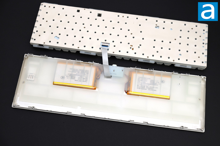 The keyboard deck sits in here with gasket mounts in between the top and bottom shell. There are eight protrusions around the deck with rubber mounts to hold in place. These gaskets should also reduce vibration or unwanted movement transferring from the deck to the rest of the enclosure. Underneath the deck, there is a thick layer of silicone to fill in the gaps of the bottom shell. It also works as an insulator for the two 5000mAh batteries underneath and the daughterboard. The two batteries add up to 10000mAh, which ensures a long battery life. I am happy to see the USB connection and switches on a separate daughterboard, as this ensures the fixed components like the USB port is isolated from movement on the keyboard deck, reducing the stress that the port may otherwise endure.