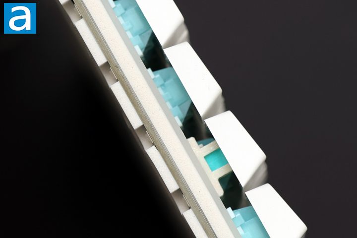 In between the plate and the PCB, there are several layers of sound damping material, including a Poron sandwich foam, IXPE switch pad, and a sound-enhancing PET layer. Under the printed circuit board, there is another layer of PORON and latex switch socket foam and the aforementioned silicone padding. All these layers contribute to the overall typing sound and feel. Underneath the sides of the PCB, there is a column of LED lights, which produce a nice side glow on the Epomaker HE108.