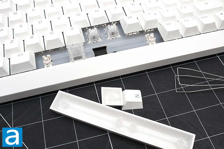 Underneath the keycaps, you can see the typical MX stem. This means you can replace the keycaps with another set. This keyboard uses south-facing lights, which is good, as there will be no interference problems using Cherry profile keycaps. I should note the space bar is oddly north-facing, but this should not affect any popular profile of keycaps. In regard to thickness, they are about 1.5mm thick, which is really good, being quite even across the keycap. The significance of the thickness of a keycap is important for the feel and pitch. To keep things simple, thicker ones have more depth and produce a deeper thock, while thinner ones produce a higher pitch sound.