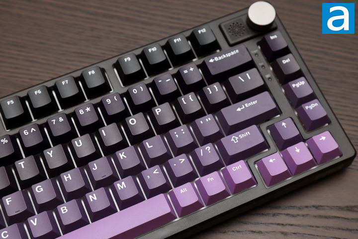The Epomaker HE75 Mag follows a standard construction when it comes to keyboards. It has a black frame with a svelte exterior. It might not exactly be the most minimal of keyboards we have seen in the past, but it also is not overbuilt in any way. The outer shell is rounded off on the corners. The primary eye-catcher with this keyboard is the gradient purple keycaps that slowly change from light magenta to black as you go from the bottom to the top row of keycaps. It might not be the most subtle of color changes, but I can appreciate this look. My girlfriend, who loves purple, immediately locked eyes with the HE75 Mag when she saw it for the keycaps alone.