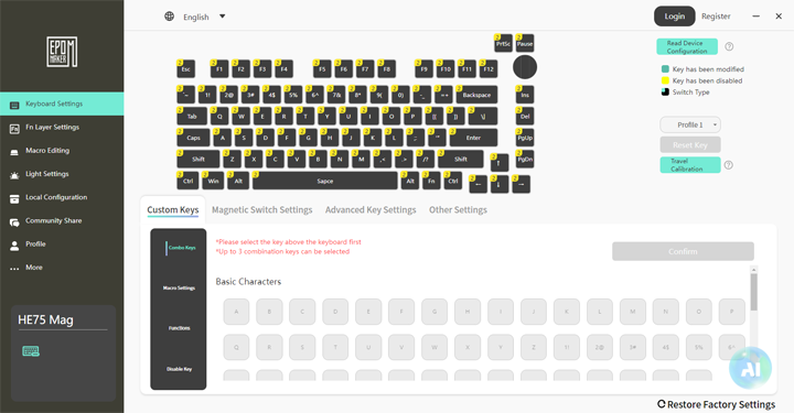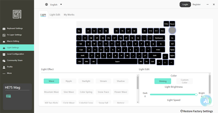 Under Light Settings, users can select and change the lighting effects with many different options available. Local Configuration menu seemed to never work for me. Epomaker allows for some more social aspects by letting you share your lighting, configurations, and macro settings with other users. You do need to register and login to an account before you can upload any of these settings, but you can always view and download other users' settings from here. Profile is presumably where you can make user changes, but again this requires you to register and log in. Under More, users can update the software and firmware for the Epomaker HE75 Mag.