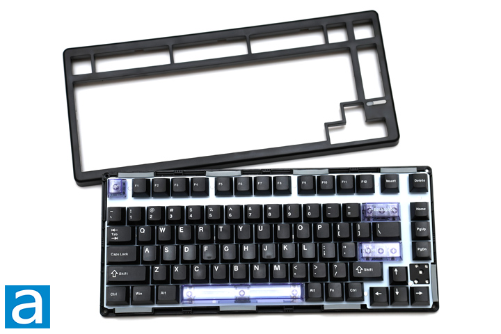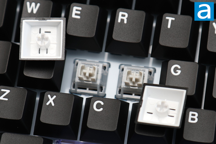 As part of our disassembly, we can start by first inspecting the keycaps. These are PBT or polybutylene terephthalate plastic with a double-shot injection. I like PBT as a material choice, as it is more durable and does not shine or fade over time compared to other commonly used plastics like ABS. The thicker wall adds to a deeper sound when pressed. The legends are inserted with a second layer of plastic, which is why it is called double shot. This is also why you see a black outer and white inner plastic. As such, the legends will not fade or wear over time, but it is a costly option for making keycaps. The choice of font is clear and legible with OEM-like writing.
