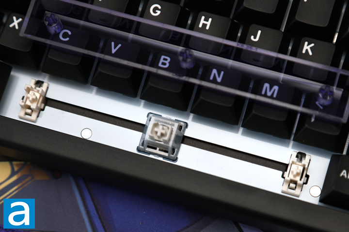 The longer keys of the Epomaker HE80, like the space bar and Enter, have Cherry stabilizers on each side to ensure an even actuation and to prevent wobbling. These are factory lubricated, as it has a smooth travel and does not rattle or squeak when the longer keys are pressed. The stabilizers are plate-mounted rather than screwed into the PCB. This is usually a cheaper alternative, as plate-mounted stabilizers can cause a bit more rattling. Thankfully, the stabilizers do not make much noise. The plate is aluminum and does not flex under pressure. This also affects how each keystroke sound with its higher pitched click.