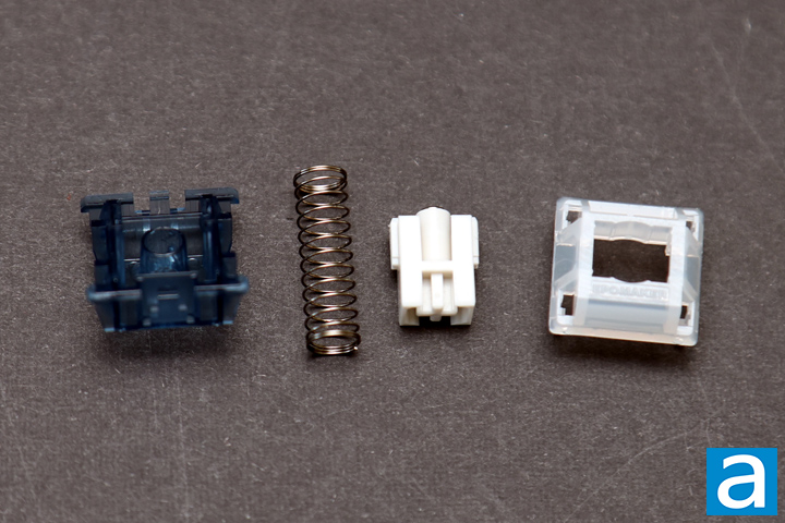 As for physical differences, the Epomaker MagneX switch has a translucent white top and clear dark blue bottom enclosure. They are both made of polycarbonate. A stem with a magnet in the bottom is made of polyoxymethylene or POM. This straddles over an 18mm spring that keeps the magnet away from the bottom until it is intentionally pressed. The switch stem has minimal lateral movement inside the enclosure, which makes the actuation feel stable and the keys have minimal wobble. The switches are also factory lubricated for a smoother typing feel and sound.